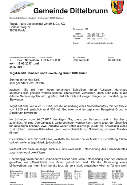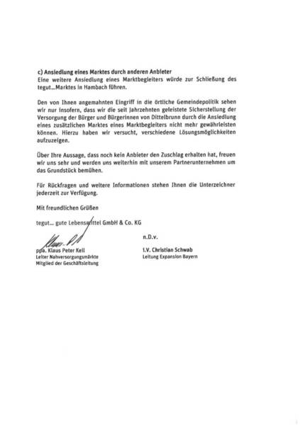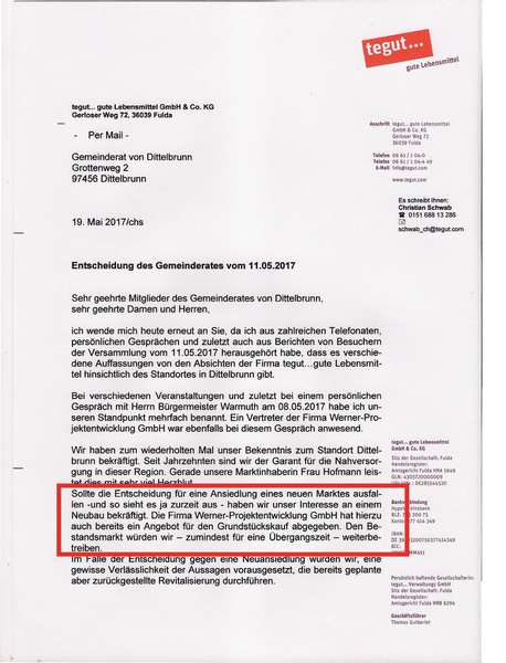 Insbesondere die Begründung, dass dies nur möglich ist, wenn tegut... den Zuschlag für Dittelbrunn erhielte, erscheint mir persönlich und betriebswirtschaftlich nicht nachvollziehbar.