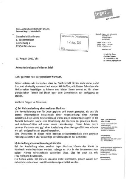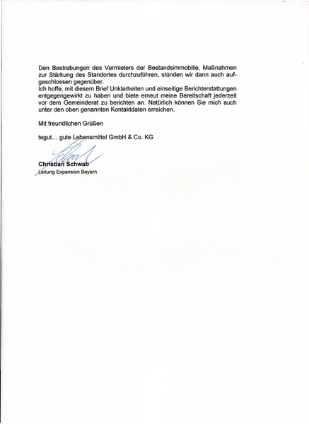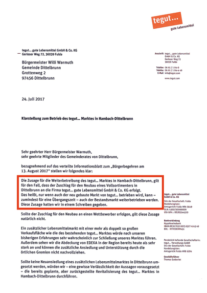 In Schreiben vom Juli nun hat tegut dies wiederholt, allerdings mit der Bedingung: " Das heißt, nur wenn auch der neugebaute Markt von tegut... betrieben wird, kann - zumindest für eine Übergangszeit - auch der Bestandsmarkt auch weiter betrieben werden".