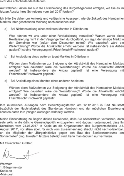 Nun wird leider in diesem Zusammenhang in Facebook auf der Seite eines Mitbewerbers, der mich für seine Seite leider gesperrt hat, vielleicht, dass ich ein solches Vorgehen nicht mitbekomme, von "gelogen" gesprochen, weil ich und die Mehrheit des Gemeinderates das erste Schreiben ohne Bedingung aufgefasst haben und davon ausgegangen sind, dass tegut... auf jeden Fall bemüht ist, den Hambacher Markt aufrecht zu erhalten.