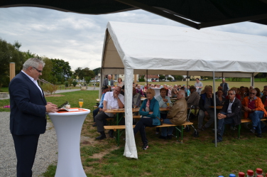 Ich wünsche allen Nutzern eine Verbesserung der Grundstimmung, viel Kommunikation, auch mit den anderen Altersgruppen, für ein Kennenlernen ist es nie zu spät, auch wenn der Altersunterschied über 70 Jahre ist, und den Segen Gottes, den uns Pfarrer Mollner anlässlich der Einweihung gespendet hat. Stellvertretende Landrätin Christine Bender, Leitender Baudirektor Manfred Grüner von der Regierung von Unterfranken und Christiane Wichmann vom AB Perlet freuten sich in ihren Grußworten über das gelungene Werk. Rund 80 Besucher wohnten der Einweihung bei. Verwaltung und Bauhof sorgten für Getränke und Bratwürstchen.